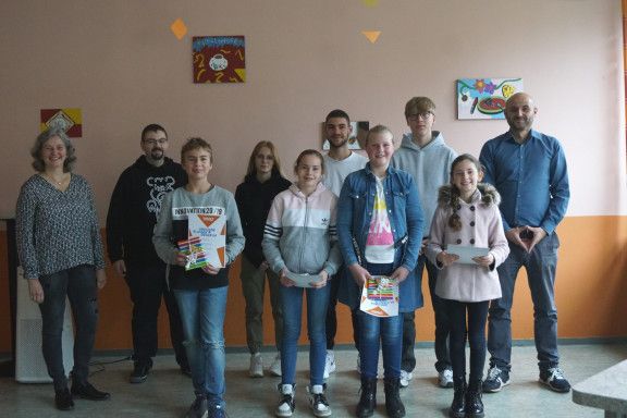 Die besten Leser der 6. Klassen der Mittelschule sind (vorne v.r.) Johanna Dobner, Thea Götz, Kristina Brandt und Maximilian Ludwig. Mit im Bild die Jurymitglieder (hinten v.r.) Hanno Kenst, Simon Belz, Ben Lauber, Lea Kaerleber, Matthias Bock sowie Renate Schmidt von der Schulleitung.