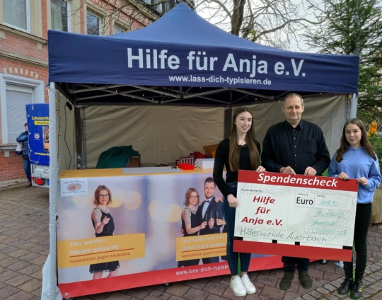 Am 19. Januar 2023 fand die Übergabe in der Mittelschule Auerbach statt. Die Schülerinnen Lena Frohnhöfer und Sophie Kopp überreichten eine Spende in Höhe von 113,50 Euro an den Vorsitzenden des Vereins Hilfe für Anja e.V., Michael Sporrer. Der Betrag wurde durch eine Weihnachtskartenaktion erlöst, bei der die Schülerinnen ihre Mitschülerinnen und Mitschüler fotografierten und die Fotos anschließend in der GreenScreen-App bearbeiteten. Das Projekt leiteten Fachlehrkraft Martina Popp und Lehrer Hanno Kenst.