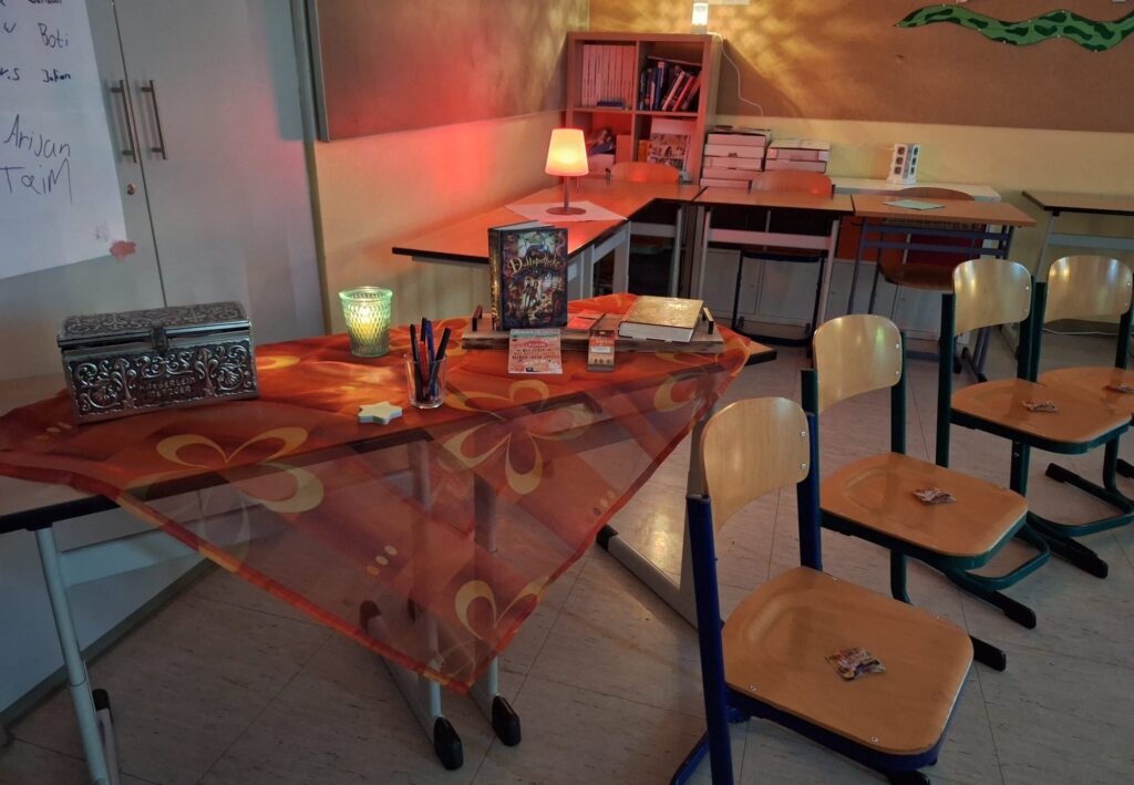Die Räume für das Lesekino wurden im Vorfeld mühevoll dekoriert. Ein Klassenzimmer wurde zum Beispiel in eine wahre „Duftapotheke“ verwandelt, ein weiteres in einen magischen, geheimnisvollen Ort ganz wie in „Bartimäus“ und in Raum 17 duftete es nach Panettone, passend zum Buch„ Abschied auf Italienisch“. So schufen die LesepatInnen eine individuelle Lese-Atmosphäre. Auch wurden Gegenstände aus dem Buch mitgebracht wie etwa bei „Kanak Kids“.