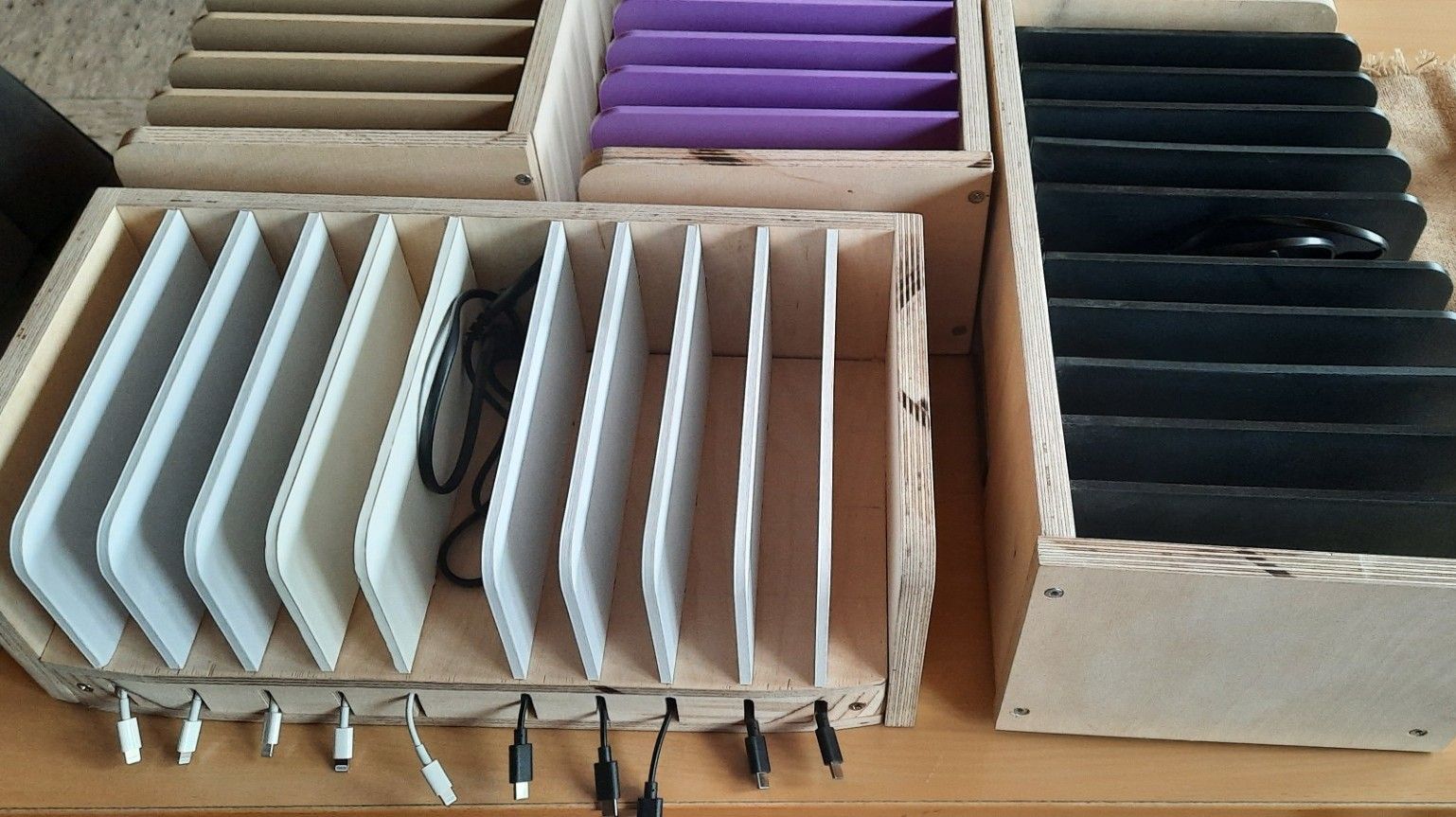 Mit viel Engagement und handwerklichem Geschick fertigte die Technik-Gruppe der 10. Klasse vier Ladestationen für die iPads der Grundschule an. Den Anstoß für das Projekt gab ein Auftrag von Herrn Rudolf Haberberger, der den Schülern eine Skizze als Grundlage überreichte.