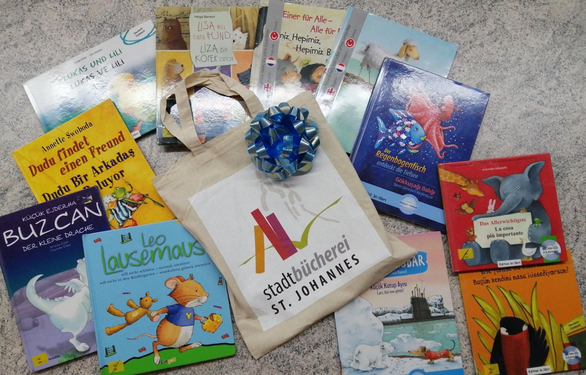 Am letzten Schultag im Jahr 2025 besuchte uns Mitarbeiterin Maike Faber von der Stadtbücherei St. Johannes. Von der Bücherei erhielt die Schule dankenswerterweise für die Lesepaten eine große Buchspende mit zweisprachigen Büchern. Da viele Kinder mehrsprachig aufwachsen sind, können die Lesepaten künftig Deutsch-Türkische Bücher und Deutsch-Ukrainische Bücher nutzen, die für Lese- und Sprachanfänger sowie zum Spracherwerb und -ausbau sehr praktisch sind. Wir bedanken uns herzlich bei der Stadtbücherei St. Johannes.